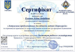 НПП кафедри «Водні Біоресурси та аквакультура», та аспірант кафедри, пройшли курси підвищення кваліфікації за темою: «Актуальна проблематика досліджень водних біоресурсів»