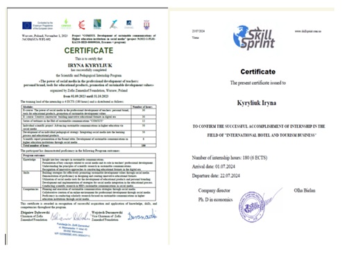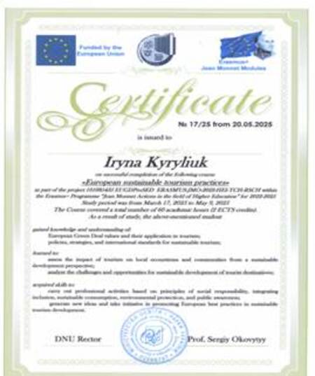 - Kozhukhivska R., Kovalenko G., Kyryliuk I., Maliuga L., Podzihun S., Sokovnina D. Competitiveness as a Basis for Tourism Development. Education Excellence аnd Innovation Management: а 2025 Vision to Sustain Economic Development During Global Challenges. (35th IBIMA). 1-12 April 2020. Seville, Spain, p. 1585–1590.