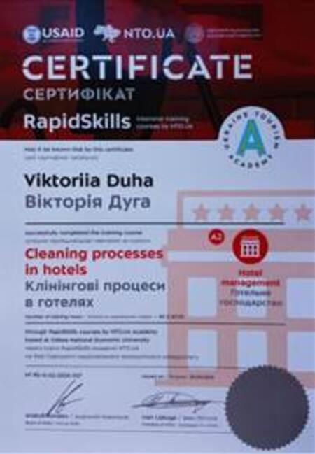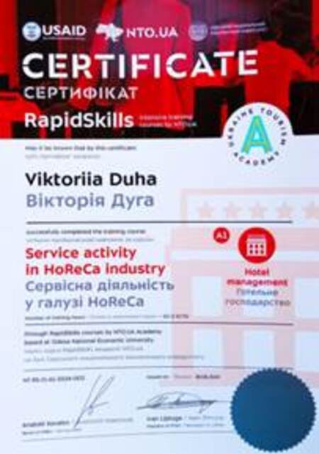 Дуга Вікторія Олександрівна – старший викладач. Кількість наукових робіт та науково-методичних праць – 63, із них: 13 статей у фахових виданнях України, 1 розділ колективної монографії, 3 навчальні посібники, 46 тез науково-практичних конференцій. Тематика НДР: «Розвиток та ефективність агротуризму як форми підприємницької діяльності». Викладає дисципліни: «Вступ до фаху», «Сервісологія», «Основи індустрії гостинності та туризму», “Менеджмент та маркетинг туризму”, «Міжнародні системи управління якістю послуг у готельно-ресторанному бізнесі та туризмі», «Барна справа», “Устаткування закладів готельно-ресторанного бізнесу” Профіль Google Scholar: Дуга Вікторія Ідентифікатор ORCID : 0000-0002-4404-4350 Е-mail: Ця електронна адреса захищена від спам-ботів. вам потрібно увімкнути JavaScript, щоб побачити її.