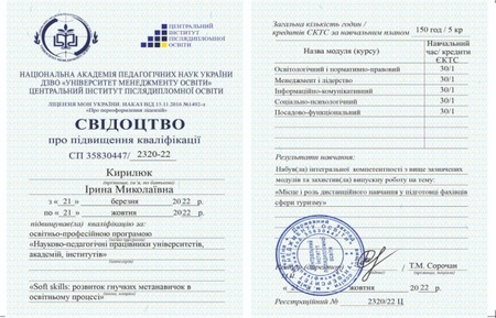 Кирилюк Ірина Миколаївна - кандидат економічних наук, доцент Кількість наукових і навчально-методичних праць - понад 110 Тематика НДР: Інновації та сталий розвиток у туризмі та індустрії гостинності Ідентифікатор ORCID: https://orcid.org/0000-0001-9814-195X Ідентифікатор автора Scopus:https://www.scopus.com/authid/detail.uri?authorId=57208614636 Ідентифікатор автора WebofScience: https://www.webofscience.com/wos/author/record/63375 Е-mail: Ця електронна адреса захищена від спам-ботів. вам потрібно увімкнути JavaScript, щоб побачити її.