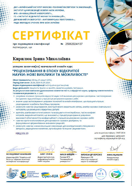 - Inna Povorozniuk, Liudmyla Neshchadym, Oksana Lytvyn, Tetiana Berbets, Iryna Filimonova, Liudmyla Zotsenko, Yevheniia Hushcha. Modelling of Demand Determinants for Full-Time Bachelor’s Degree Programs in Hospitality and Catering: The Case of Ukrainian Higher Education Institutions. International Journal of Computer Science and Network Security. 2022. vol.22 №.1, January р. 347-357. Web of Science. URL: http://paper.ijcsns.org/07_book/202201/20220149.pdf