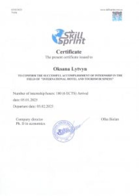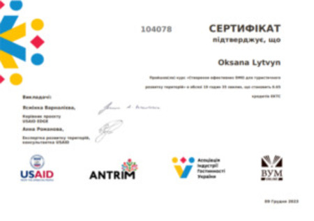 Литвин Оксана Вікторівна – доктор філософії, доцент. Кількість наукових та навчально-методичних праць – видано понад 70 наукових публікацій, з них 3 статті у науковому журналі з міжнародної наукометричної бази (Web of Science), 17 – у фахових виданнях, 7 – розділів колективних монографій. Тематика НДР: управління туристичною діяльністю в умовах глобальних викликів Викладає дисципліни: “Менеджмент готельно-ресторанного бізнесу”, “Логістичне забезпечення ГРБ”, “Аналітика в індустрії гостинності”, “Стратегічне управління розвитком туризму та індустрії гостинності”, “Фінансовий та проєктний менеджмент у сфері обслуговування”, “Бізнес-аналітика”, “Управління проєктами”. Профіль Google Scholar: https://scholar.google.com.ua/citations?user=59TwcGEAAAAJ&hl=uk Ідентифікатор ORCID: https://orcid.org/0000-0003-2616-468X Ідентифікатор автора WebofScience: https://www.webofscience.com/wos/author/record/783057 E-mail: Ця електронна адреса захищена від спам-ботів. вам потрібно увімкнути JavaScript, щоб побачити її.