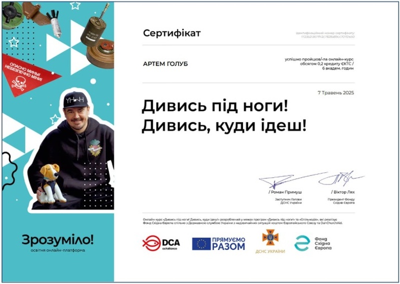 Онлайн-курс «Дивись під ноги! Дивись, куди йдеш!» розроблений у межах програм «Дивись під ноги!» та «Спільнодія», які реалізує Фонд Східна Європа спільно з Державною службою України з надзвичайних ситуацій коштом Європейського Союзу та DanChurchAid.