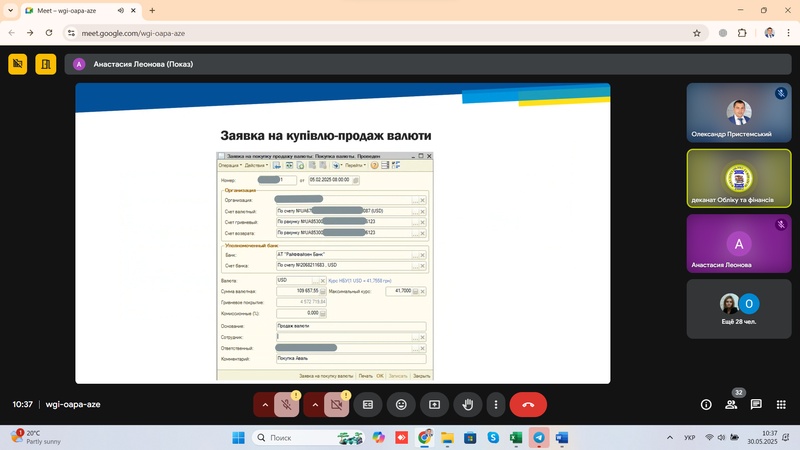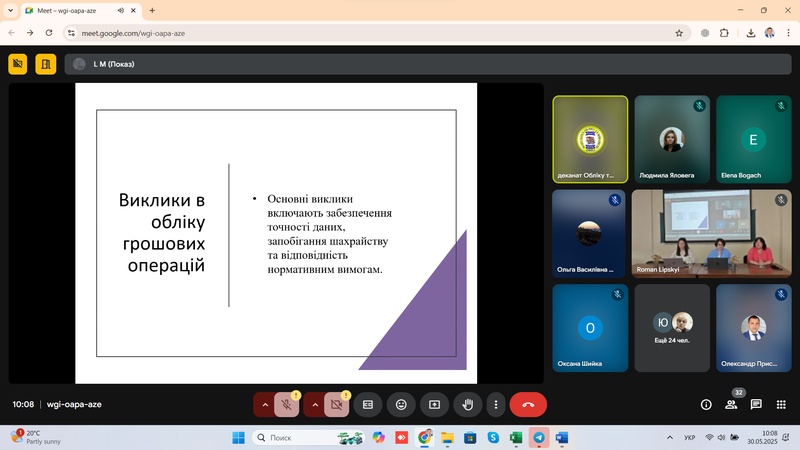 30 травня 2025 року відбулася гостьова онлайн-лекція, що поєднала теоретичну підготовку здобувачів із практичними аспектами професійної діяльності у сфері обліку. Викладачі кафедри підприємництва, обліку та фінансів (проф. Пристемський О.С., доц. Сакун А.Ж., доц. Коваль С.В.) взяли участь спільно із здобувачами вищої освіти спеціальності D1 Облік і оподаткування у межах реалізації навчальної практики, яка є важливою складовою освітньої програми «Облік і оподаткування». Захід було проведено на платформі Google Meet у форматі професійного діалогу з фахівцями-практиками на тему: «Облік грошових коштів та розрахунків».
