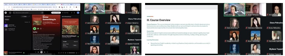 Курс проводить викладачка з США — Севіа Єллін (Cevia Yellin), яка має багатий досвід у викладанні та міжнародних освітніх проєктах. Уже під час першого заняття студенти змогли відчути атмосферу міжнародної співпраці та зробили перші кроки у вивченні тем, що поєднують аграрну сферу й інновації.