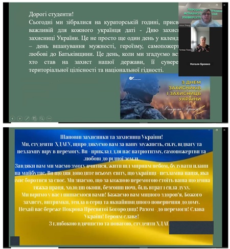 1 жовтня кураторами академічних груп кафедри підприємництва, обліку та фінансів було проведено кураторську годину, присвячену Дню захисників і захисниць України. Це свято є символом мужності, незламності та відваги всіх, хто в різні часи боронив і боронить нашу державу, хто відстоює її незалежність та територіальну цілісність.