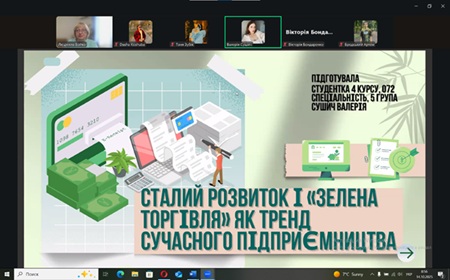 Сушич В. виступила з темою «Сталий розвиток і «зелена торгівля» як тренд сучасного підприємництва», наголосивши на важливості екологічної відповідальності у веденні торговельної діяльності.