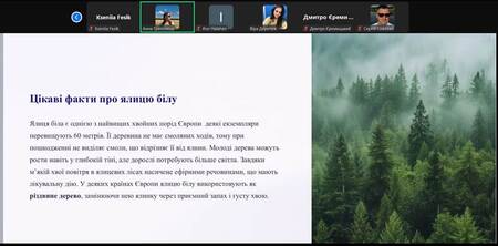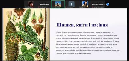 Під час заняття Ігор ГАЛАГАН представив екологічну характеристику сосни звичайної, а Анна ТРЕПОЛЕЦЬ – ялиці білої. Особливої уваги заслуговує виступ Ксенії ФЕСІК, яка організувала пряму відео-трансляцію з Брюховицького мішаного лісу, розташованого на пагорбах Розточчя (Львівщина). У режимі онлайн здобувачка вищої освіти знайомила одногрупників із рослинним покривом цього лісу, демонструючи сосну, бук, граб, дуб, ліщину, адоксу мускусну, ожину, хвощ, мохи та інші види рослин.
