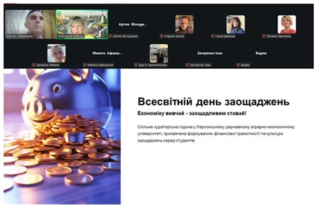 30 жовтня у Херсонському аграрно-економічному університеті відбулася спільна кураторська година у дистанційному форматі на платформі ZOOM, яку провели куратори Валентина Зубенко та Віктор Литвиненко, кафедри гідротехнічного будівництва, водної та електричної інженерії. Захід був присвячений Міжнародному дню заощаджень.