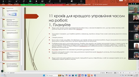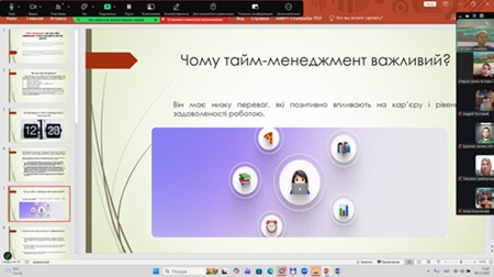 Куратор Шнайдер Світлана привітала студентів та акцентувала увагу на актуальності теми тайм-менеджменту в сучасних умовах, особливо для молоді, яка поєднує навчання у вищому закладі освіти з підробітком та сімейними обов’язками.