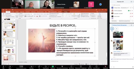 Лекція присвячена сучасним підходам до розуміння того, як творчий процес та взаємодія з мистецтвом впливають на психологічний стан людини. Особливу увагу аудиторії привернув інтерактивний майстер-клас «Наснаження від виснаження». У його рамках спікерка поділилася дієвими техніками для підтримки ментального здоров'я та пошуку внутрішньої опори. Учасники обговорили практичні поради з презентації «Будьте в ресурсі!», серед яких були такі важливі тези, як «Навчіться говорити «ні», «Не чекайте допомоги — просіть про неї» та заклик свідомо насолоджуватися приємними моментами вже сьогодні.