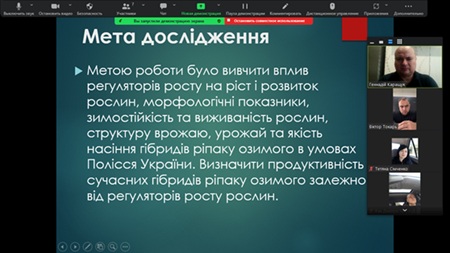 Доповідач зазначив мету цієї наукової роботи, яка полягала у тому, щоб вивчити вплив регуляторів росту на ріст і розвиток рослин, морфологічні показники, зимостійкість та виживаність рослин, структуру врожаю, урожай та якість насіння гібридів ріпаку озимого.