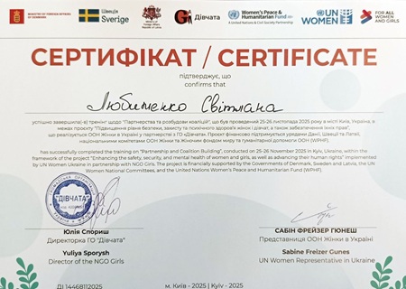 За результатами навчання Світлана Любименко отримала сертифікат, що підтверджує її участь та здобуті компетенції.
