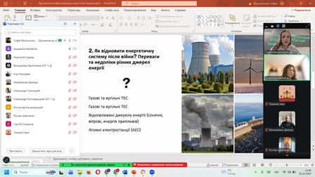 На заході були присутні здобувачі вищої освіти першого (бакалаврського) та другого (магістерського) рівня вищої освіти. Було обговорено актуальну проблему повоєнного відновлення енергетичної інфраструктури та можливий вплив різних джерел енергії на біорізноманіття в контексті досягнення цілей сталого розвитку.