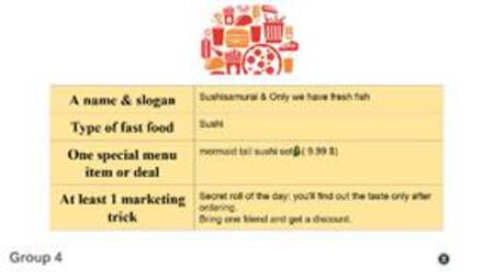 Після теоретичної частини старшокласники активно включилися в інтерактивні завдання. Вони працювали в групах, аналізували зразки меню та визначали, які саме маркетингові прийоми там використані. Кожна група виявила неймовірну креативність, розробивши назву та слоган, тип кухні (від бургерів до суші-to-go), спеціальну пропозицію чи фірмову страву (наприклад, «Студентське комбо»), застосувавши обов’язковий маркетинговий прийом. Учні презентували свої бізнес-ідеї та рекламні стратегії англійською мовою, спробувавши себе в ролі справжніх маркетологів та аналітиків.