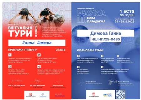 У період з 11 по 20 листопада 2025 року Ганна ДИМОВА пройшла онлайн-стажування «Віртуальні тури в освіті», присвячене впровадженню VR-технологій у навчальний процес.