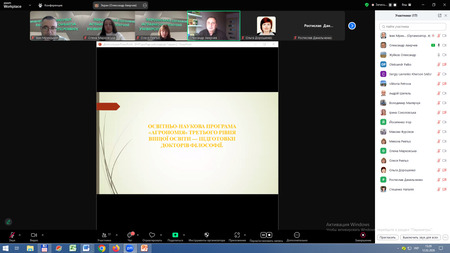 Запрошені: завідувачі випускових кафедр: кафедри землеробства – доктор с.-г. наук, професор Аверчев О.В., гарант ОНП Агрономія третього (освітньо-наукового) рівня вищої освіти; кафедри рослинництва та агроінженерії – кандидат с.-г. наук, доцент Ревтьо О.Я., гарант ОПП Агроінженерія першого (бакалаврського) рівня вищої освіти; кафедри ботаніки та захисту рослин – доктор с.-г. наук, професор Марковська О.Є., гарант ОПП Захист і карантин рослин другого (магістерського) рівня вищої освіти; гарант ОПП Агрономія першого (бакалаврського) рівня вищої освіти кандидат с.-г. наук, доцент Лавренко С.О.; гарант ОПП Агрономія другого (магістерського) рівня вищої освіти доктор с.-г. наук, професор Жуйков О.Г.; гарант ОПП Садівництво, плодоовочівництво та виноградарство першого (бакалаврського) рівня вищої освіти кандидат с.-г. наук, доцент Соколовська І.М.; здобувачі вищої освіти першого (бакалаврського) рівня Петрова В.О., Фурсенко М.С., третього (освітньо-наукового) рівня вищої освіти Палько О.О.