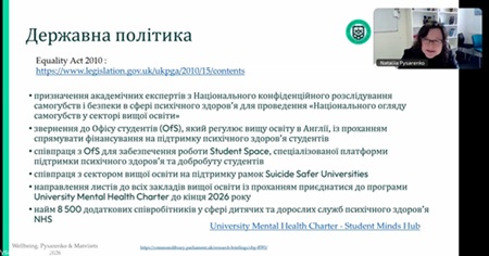 Під час вебінару було представлено практичний досвід британських університетів щодо організації формальних і неформальних механізмів підтримки студентів, адаптації навчальних процесів до потреб здобувачів з особливими освітніми потребами та інтеграції принципів турботи у систему забезпечення якості освіти.