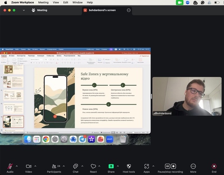 Спікер розкрив практичні аспекти роботи з AI-платформами (Midjourney, DALL-E, Adobe Firefly), пояснив принципи формування ефективного промпту (об’єкт + стиль + контекст), особливості використання негативного промпту та техніки «prompt surgery» для покращення результатів генерації. Окрему увагу було приділено технічним деталям — світлу, композиції, параметрам камери, форматам для соціальних мереж та принципу Safe Zones у вертикальному відео.