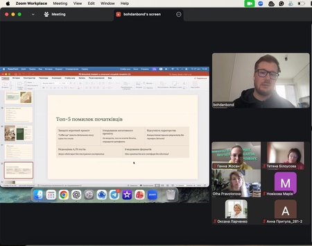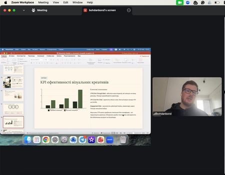 У межах лекції розглядалися питання A/B тестування візуальних креативів, оцінювання їх ефективності через KPI (CTR, CPC, Engagement Rate), а також практичний маркетинговий воркфлоу — від брифу до тестування результатів. Богдан Бондар наголосив, що AI є не замінником креативності, а інструментом її підсилення, який скорочує час створення контенту з кількох тижнів до кількох днів.