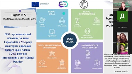 За допомогою AI-інструменту NotebookLM здобувачі працювали з офіційними документами Європейського Союзу, зокрема у сфері Digital Decade 2030, регулювання штучного інтелекту та захисту даних. Результатом стала розробка інтерактивних «Карт цифрової конвергенції» України та ЄС, що відобразили інституційні, технологічні та регуляторні вузли інтеграції.