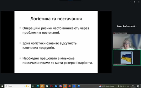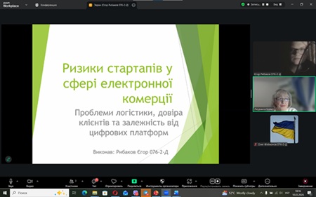 Цікавою була також доповідь Геріни Кіри та Єгора Рибакова, які досліджували тему «Ризики стартапів у сфері електронної комерції». У виступі здобувачі проаналізували основні проблеми, що виникають під час розвитку онлайн-бізнесу, зокрема труднощі логістики, необхідність формування довіри клієнтів, високий рівень конкуренції на цифрових платформах, а також залежність підприємців від онлайн-маркетплейсів та алгоритмів цифрових сервісів.