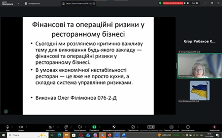 Зокрема, Філімонов Олег представив доповідь на тему «Фінансові та операційні ризики у сфері ресторанного бізнесу в умовах економічної нестабільності». У своїй презентації доповідач звернув увагу на ключові виклики, з якими стикаються заклади громадського харчування. Серед них – коливання цін на продукти, зміна купівельної спроможності населення, а також необхідність постійного оновлення концепцій, меню та рівня сервісу для збереження конкурентних позицій на ринку.