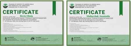 Доценти кафедри рослинництва та агроінженерії Херсонського державного аграрно-економічного університету Олеся РЕВТЬО та Анастасія МАЛЯРЧУК успішно пройшли навчання у Сумському національному аграрному університеті за міжнародною програмою «Підготовка експертів з оцінки ґрунтів та відновлення територій, пошкоджених внаслідок бойових дій» і отримали відповідні сертифікати.