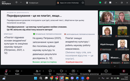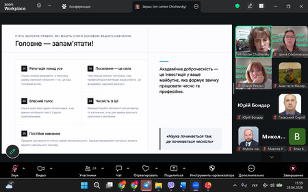 Зустріч пройшла у форматі жвавого обговорення актуальних питань академічної доброчесності. Учасники не лише ознайомилися з основними принципами створення наукового тексту, а й детально розглянули правила цитування, оформлення бібліографічного опису джерел, використання інтернет-ресурсів, а також такі важливі поняття, як плагіат і коректне перефразування.
