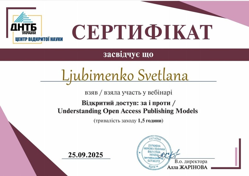У вересні 2025 року в.о. директора наукової бібліотеки Херсонського державного аграрно-економічного університету Світлана Любименко взяла участь у професійному вебінарі «Відкритий доступ: за і проти / Understanding Open Access Publishing Models».