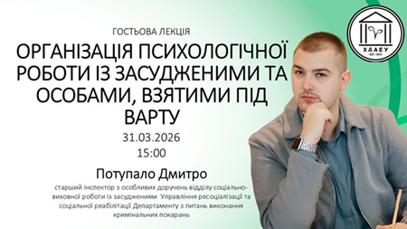У межах серії професійно-орієнтованих зустрічей для здобувачів вищої освіти та викладачів кафедри соціальних та поведінкових наук ХДАЕУ відбулася змістовна гостьова лекція з теми «Організація психологічної роботи із засудженими та особами, взятими під варту».