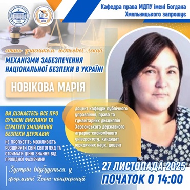 27 листопада 2025 року доцент кафедри публічного управління, права та гуманітарних дисциплін ХДАЕУ, кандидат юридичних наук Марія Новікова провела гостьову лекцію для студентів кафедри права МДПУ імені Богдана Хмельницького на тему «Механізми забезпечення національної безпеки в Україні».