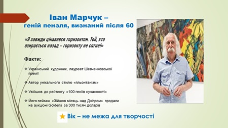 Наукова бібліотека ХДАЕУ пропонує добірку надихаючих прикладів людей, які досягли значних успіхів після 60 років. Вони доводять, що ніколи не пізно реалізувати мрію чи змінити життя: поетеса Ліна Костенко, художник Іван Марчук, фотомодель Леся Салата, засновник мережі ресторанів Гарланд Сандерс, тренерка з йоги Тао Порчон-Лінч.