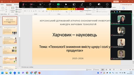 У грудні 2025 року відбулося чергове засідання наукового гуртка «Харчовик-науковець» кафедри харчових технологій ХДАЕУ на тему: «Технології зниження вмісту цукру і солі у продуктах» присвячене актуальній темі зниження вмісту цукру та солі у харчових продуктах як одному з ключових напрямів сучасних харчових технологій та здорового харчування.