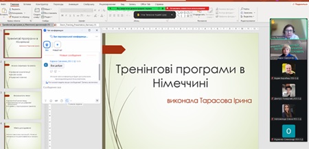 Окремим вагомим блоком зустрічі став виступ здобувачки Ірини Тарасової, яка презентувала доповідь та змістовну презентацію на тему «Тренінгові програми в Німеччині», поділившись європейським досвідом організації групової психологічної роботи.
