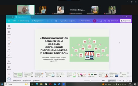 Дробот А. розповіла про «Франчайзинг як ефективну форму організації підприємництва у сфері торгівлі», звернувши увагу на переваги та перспективи цієї моделі бізнесу.