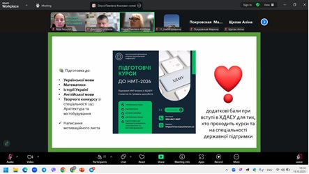 Під час заходу було представлено основні напрями підготовки в Херсонському державному аграрно-економічному університеті, особливості вступної кампанії 2026 року, переваги навчання за спеціальністю кафедри, можливості академічної мобільності та працевлаштування випускників.