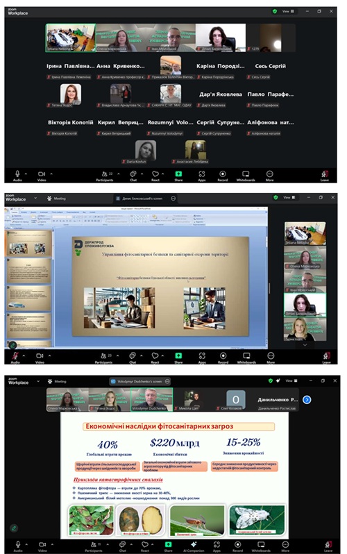 Після вирішення організаційних питань учасники долучилися до засідання наукового гуртка «Фітосанітарний експерт» ОДАУ, присвяченому актуальному і важливому питанню фітосанітарної безпеки країни. Запрошений спікер – Денис БЯЛКОВСЬКИЙ, в.о. заступника начальника управління-начальник відділу фітосанітарних заходів на кордоні та санітарної охорони території Головного управління Держпродспоживслужби в Одеській області. У своїй доповіді він зосередив увагу присутніх на важливості здійснення ефективного фітосанітарного нагляду та системного моніторингу поширення шкідливих організмів з метою забезпечення сталого розвитку аграрного виробництва країни, особливо у прикордонних регіонах, які стикаються з ризиками проникнення небезпечних карантинних видів. До обговорення долучилися декан агрономічного факультету ХДАЕУ, канд. с.-г. наук Іван МРИНСЬКИЙ, завідувач кафедри ботаніки та захисту рослин, доктор с.-г. наук, професор Олена МАРКОВСЬКА, доцент кафедри зоології, ентомології, фітопатології, інтегрованого захисту і карантину рослин ім. Б.М. Литвинова ДБТУ, канд. біол. наук Ірина ЛЕЖЕНІНА. Усі виступаючі відмітили позитивну роль таких міжуніверситетських заходів для зростання наукового сприйняття студентами актуальних проблем сучасного агровиробництва, у т.ч. в захисті рослин та запропонували цікаві ідеї для майбутніх засідань наукових гуртків.