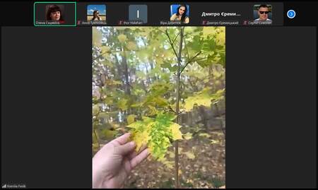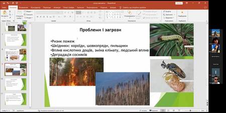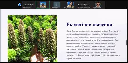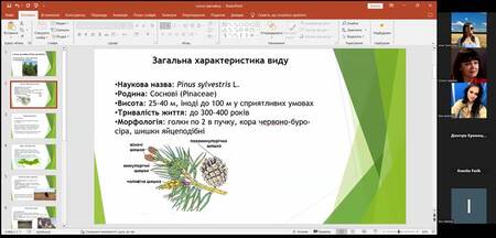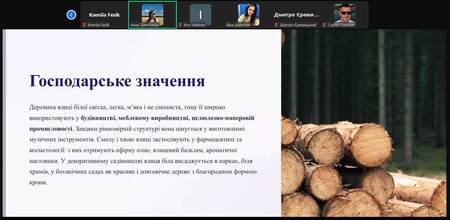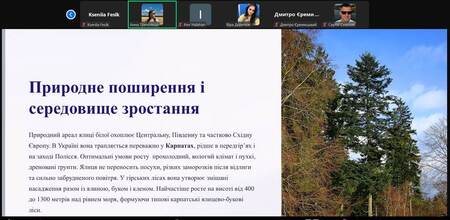 Під час заняття Ігор ГАЛАГАН представив екологічну характеристику сосни звичайної, а Анна ТРЕПОЛЕЦЬ – ялиці білої. Особливої уваги заслуговує виступ Ксенії ФЕСІК, яка організувала пряму відео-трансляцію з Брюховицького мішаного лісу, розташованого на пагорбах Розточчя (Львівщина). У режимі онлайн здобувачка вищої освіти знайомила одногрупників із рослинним покривом цього лісу, демонструючи сосну, бук, граб, дуб, ліщину, адоксу мускусну, ожину, хвощ, мохи та інші види рослин.