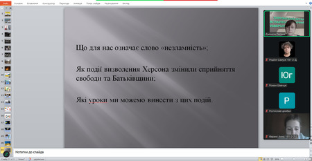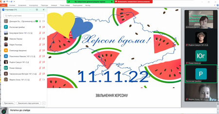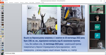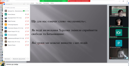 Під час заходу здобувачі освіти пригадали події 11 листопада 2022 року — дня, коли Збройні Сили України звільнили Херсон після тривалої окупації. Студенти переглянули відеоматеріали, присвячені героїчному визволенню міста, обговорили значення цієї події для всієї України та вшанували пам’ять загиблих захисників хвилиною мовчання.