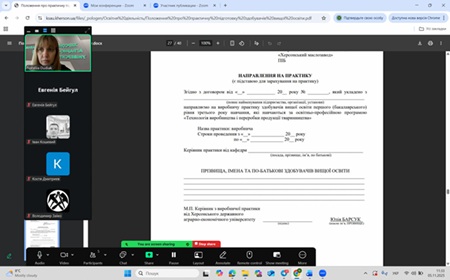 Для здобувачів факультету архітектури та будівництва на передодні початку переддипломної практики відбулися зустрічі з керівниками щодо організації проходження практики. На семінарі присвячений організації проведення переддипломних практик Дудяк Наталія наголосила, що основним нормативним документом, який регулює порядок організації, проведення і підбиття підсумків практик у Херсонському державному аграрно-економічному університеті є «Положення про практичну підготовку здобувачів вищої освіти Херсонського державного аграрно-економічного університету».