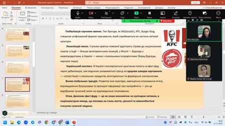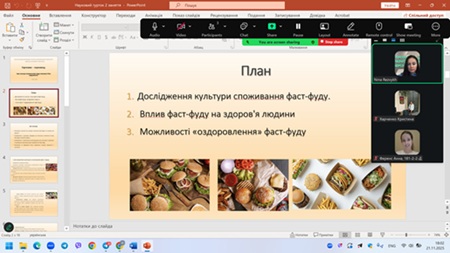 Керівник гуртка окреслила цілі та завдання дослідження, представила актуальні наукові підходи до аналізу впливу фаст-фуду на здоров’я, а також перспективи створення оздоровлених альтернатив традиційним швидким стравам.