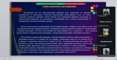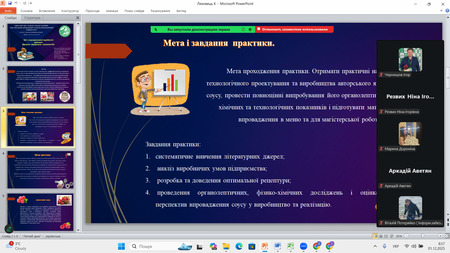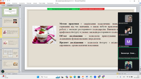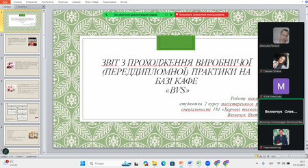 Кожна доповідь супроводжувалася змістовною мультимедійною презентацією, що забезпечило наочність результатів експериментальних досліджень, виробничих спостережень і проведених аналітичних робіт. Студенти впевнено орієнтувалися у матеріалах власних звітів, чітко викладали послідовність виконання виробничих завдань та демонстрували готовність до професійної діяльності у галузі харчових технологій.
