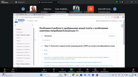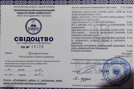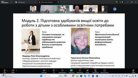 Значну увагу було приділено практичним аспектам підготовки викладачів до роботи в умовах інклюзивної освіти, зокрема розвитку мовлення у здобувачів з особливими освітніми потребами, застосуванню ABA-терапії, методам сенсорної інтеграції, а також використанню ефективного методичного інструментарію та диференційованого викладання. Завершальним етапом програми стало фінальне тестування, яке підтвердило досягнення заявлених результатів навчання.