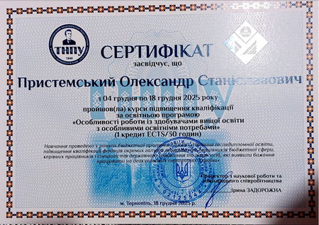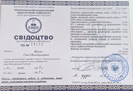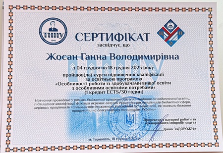 У грудні 2025 року науково-педагогічні працівники Херсонського державного аграрно-економічного університету пройшли підвищення кваліфікації за освітньою програмою «Особливості роботи із здобувачами вищої освіти з особливими освітніми потребами», організованою Тернопільським національним педагогічним університетом імені Володимира Гнатюка.