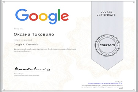 Під час проходження даного курсу учасники дізналися як використовувати AI без технічного досвіду та отримали доступ до воркбуку з додатковою інформацією та вправами. За результатами успішного проходження курсу Оксана Токовило отримали сертифікат.
