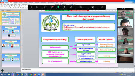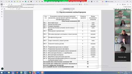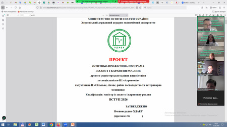 Запрошені: завідувачі випускових кафедр: кафедри землеробства – доктор с.-г. наук, професор Аверчев О.В., гарант ОНП Агрономія третього (освітньо-наукового) рівня вищої освіти; кафедри рослинництва та агроінженерії – кандидат с.-г. наук, доцент Ревтьо О.Я., гарант ОПП Агроінженерія першого (бакалаврського) рівня вищої освіти; кафедри ботаніки та захисту рослин – доктор с.-г. наук, професор Марковська О.Є., гарант ОПП Захист і карантин рослин другого (магістерського) рівня вищої освіти; гарант ОПП Агрономія першого (бакалаврського) рівня вищої освіти кандидат с.-г. наук, доцент Лавренко С.О.; гарант ОПП Агрономія другого (магістерського) рівня вищої освіти доктор с.-г. наук, професор Жуйков О.Г.; гарант ОПП Садівництво, плодоовочівництво та виноградарство першого (бакалаврського) рівня вищої освіти кандидат с.-г. наук, доцент Соколовська І.М.; здобувачі вищої освіти першого (бакалаврського) рівня Петрова В.О., Фурсенко М.С., третього (освітньо-наукового) рівня вищої освіти Палько О.О.