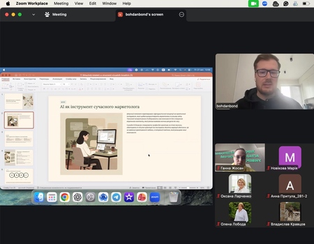 Для здобувачів освітніх програм економічного факультету відбувся виступ Богдана Бондаря — менеджера із залучення клієнтів та здобувача третього (освітньо-наукового) рівня вищої освіти ХДАЕУ. Тема зустрічі була присвячена використанню штучного інтелекту у створенні візуальних креативів та трансформації цифрового маркетингу.