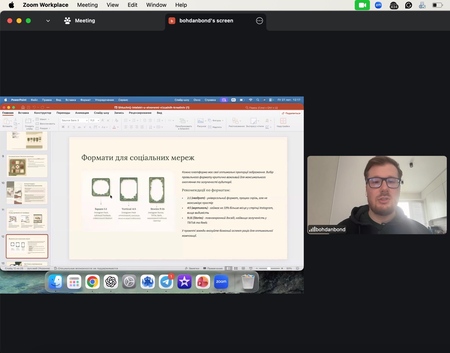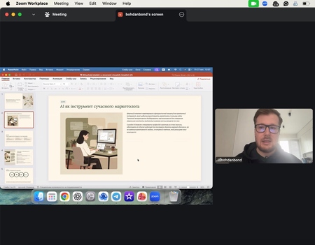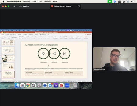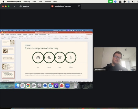 У межах лекції розглядалися питання A/B тестування візуальних креативів, оцінювання їх ефективності через KPI (CTR, CPC, Engagement Rate), а також практичний маркетинговий воркфлоу — від брифу до тестування результатів. Богдан Бондар наголосив, що AI є не замінником креативності, а інструментом її підсилення, який скорочує час створення контенту з кількох тижнів до кількох днів.