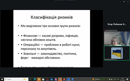 Зокрема, Філімонов Олег представив доповідь на тему «Фінансові та операційні ризики у сфері ресторанного бізнесу в умовах економічної нестабільності». У своїй презентації доповідач звернув увагу на ключові виклики, з якими стикаються заклади громадського харчування. Серед них – коливання цін на продукти, зміна купівельної спроможності населення, а також необхідність постійного оновлення концепцій, меню та рівня сервісу для збереження конкурентних позицій на ринку.